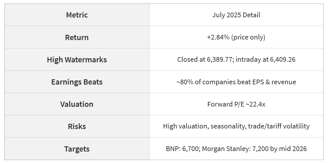 The index hit multiple record highs during the month: it closed at a historic 6,389.77 on July 28, with an intraday peak of 6,409.26 on July 29 Wikipedia. For context, July closed significantly above the June 1 level of ~6,029.95, illustrating solid upward momentum Multpl+1Cinco Días+1.