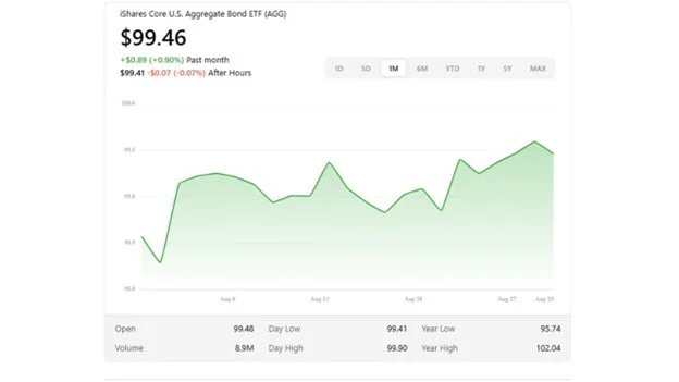 The iShares Core U.S. Aggregate Bond ETF (AGG)—a benchmark for intermediate-term core bonds—ended August near $99.46–$99.57, reflecting modest monthly gains or flat performance DC College Savings+8StockAnalysis+8BlackRock+8.Healthy Yields and Fund Structure